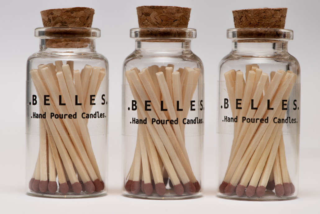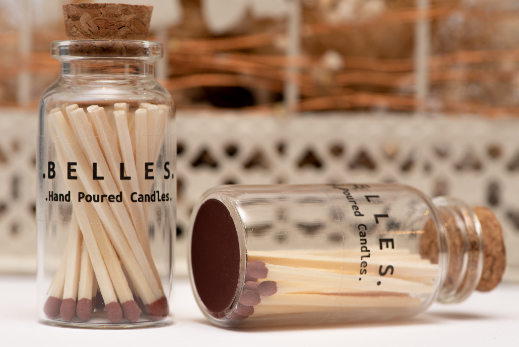 Glass jar of matches with cork stopper.
